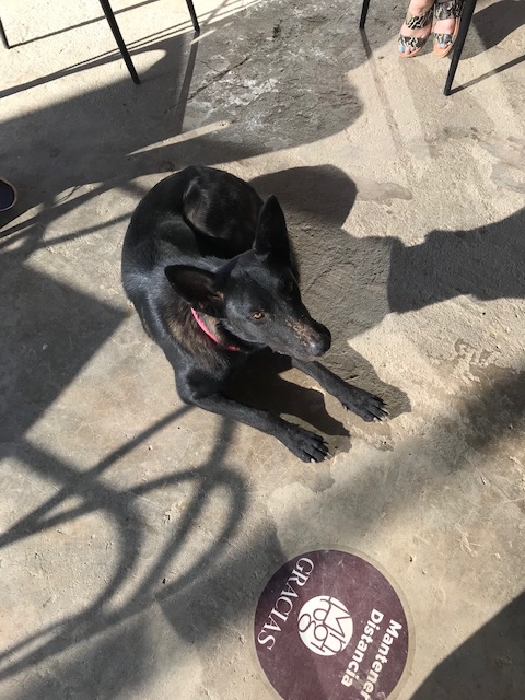 While waiting for a staff member to come over to our patio table we noticed some tables had cheese platters and decided to order one for ourselves. It was a very nice cheese and meat plate but did not come with utensils of any sort to cut the pieces of cheese nor any plates, only a few cocktail napkins that were sitting out on our table. So basically, we pulled out our alcohol wipes and cleaned our hands then used fingers to break up the cheeses to share and eat. We had ordered the “Astral” Tasting [$1,155.00 Pesos per person to taste 3 wines] with astrological themed labels and reportedly focused on young wines and blends with “fresh and lively flavors”, okay then!